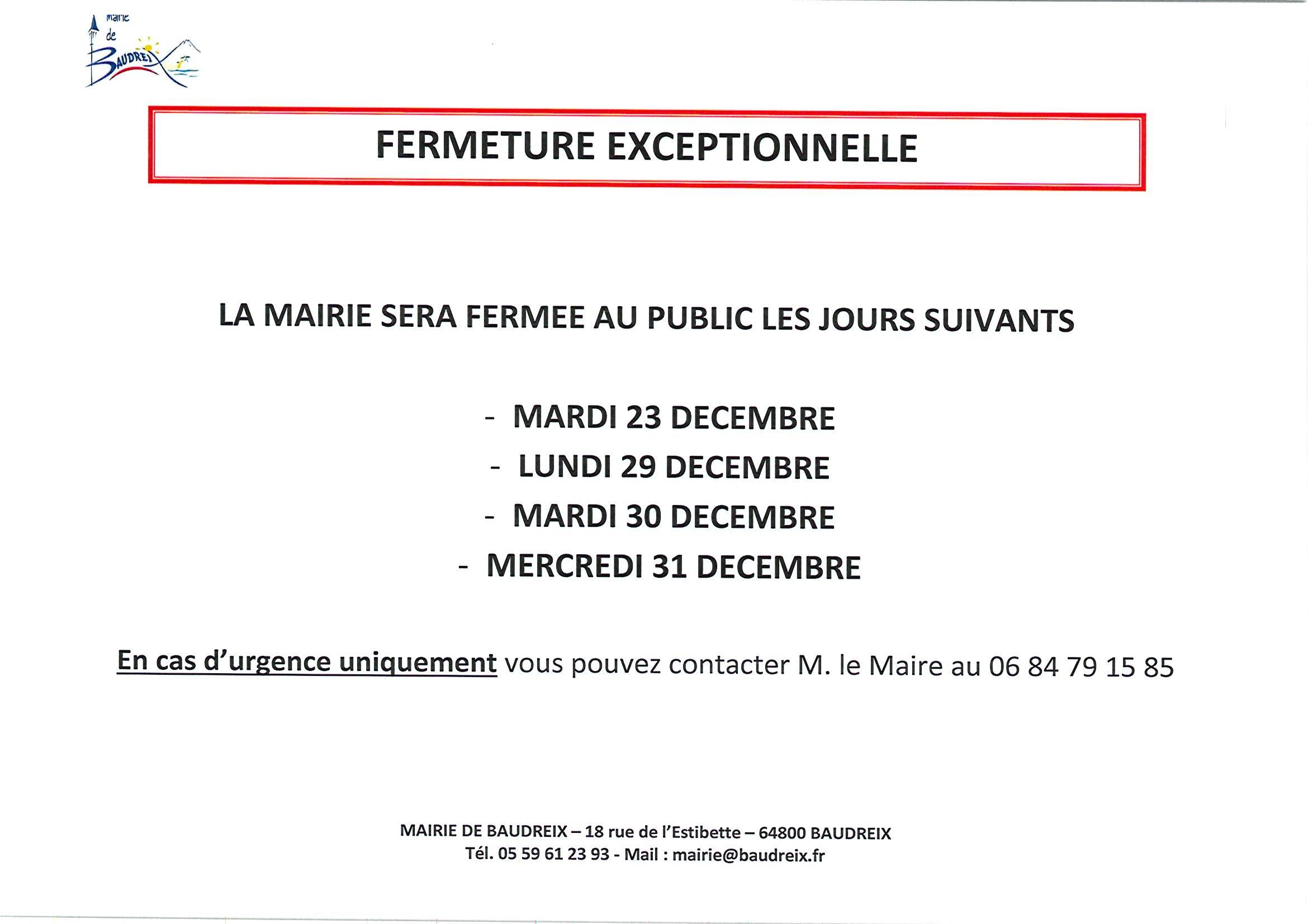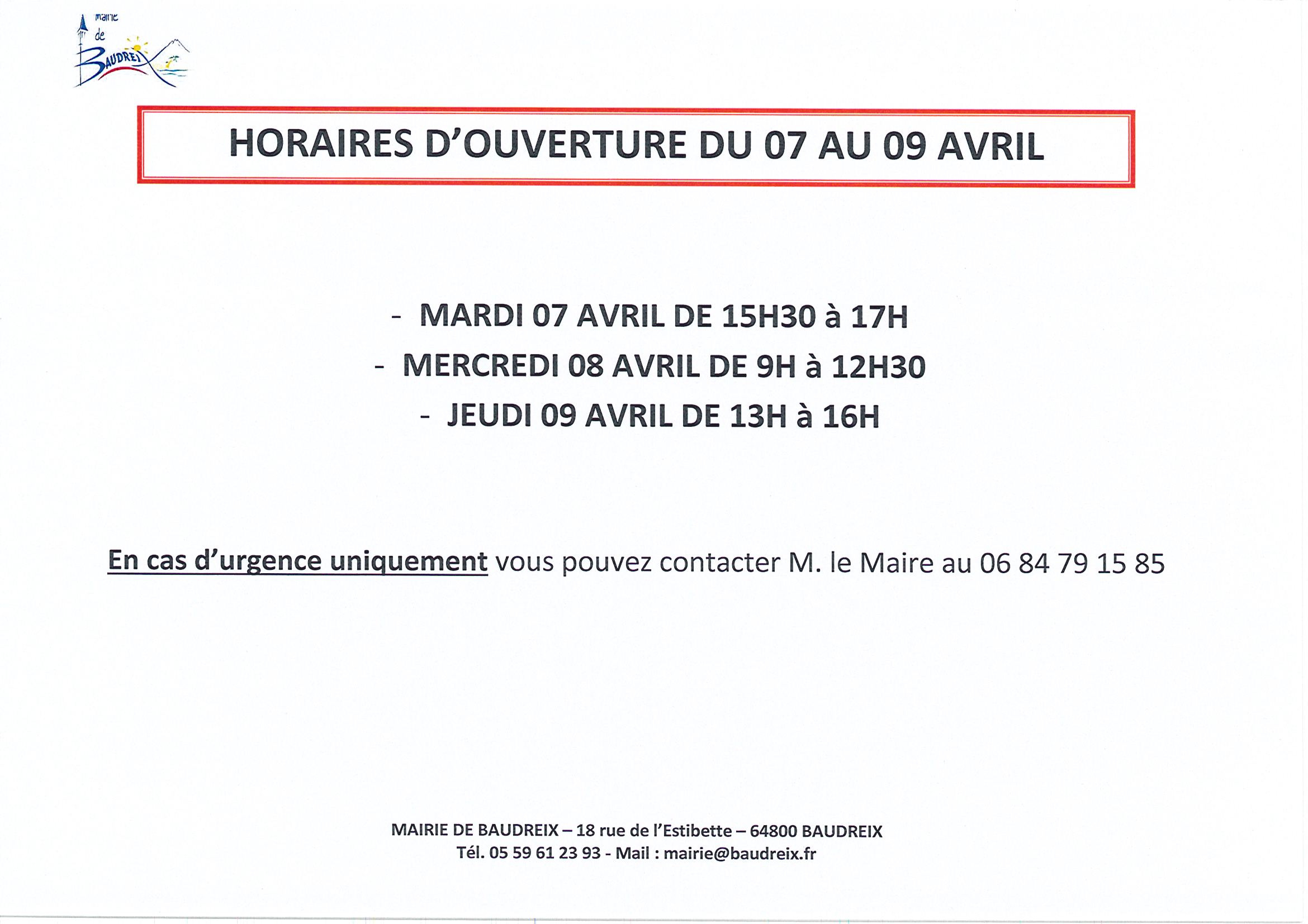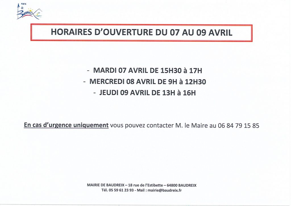 Horaires ouverture de la mairie du 07 au 09 avril